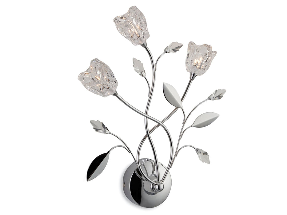 The Cindy 3 Light Wall features an elegant, contemporary design with intricate flower and leaf effects made from a combination of metal and clear glass. The chrome finish adds a touch of sophistication, making it perfect for living rooms, hallways, or bedrooms. Designed to be used with LED G9 lamps, this stylish wall light is both energy-efficient and eye-catching.