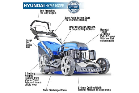 The Hyundai HYM510SPE is a high-performance, self-propelled petrol lawn mower designed for medium to large lawns. Featuring a powerful Hyundai IC17...