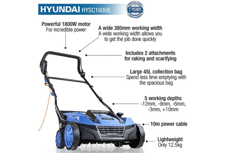 The Hyundai HYSC1800E is a powerful and efficient electric lawn scarifier and aerator, designed to rejuvenate small to medium-sized lawns (up to 18...