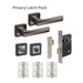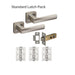 Feature 0: Standard door handle latch pack. Each pack comes with a pair of handles, a latch, a strike plate and three quality ball bearing hinges