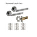Feature 0: Standard door handle latch pack. Each pack comes with a pair of handles, a latch, a strike plate and three quality ball bearing hinges