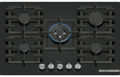 Experience precise flame control and stylish design with the Bosch Series 6 PPQ7A6I40 75cm Gas Hob in sleek black glass. This built-in Bosch gas ho...