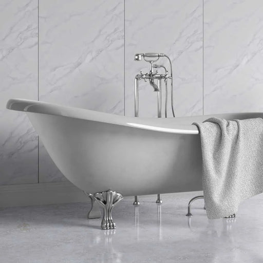 Bring a touch of luxury to your bathroom with Decorwall Maxi Panel – Gloss Grey Marble – 2400mm x 900mm x 10mm, a high-quality PVC wall panel desig...