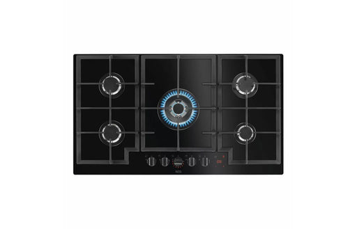 Add a touch of elegance and power to your kitchen with the AEG HKB95450NB 90cm Gas on Glass Hob in black. This stunning built-in gas hob combines s...