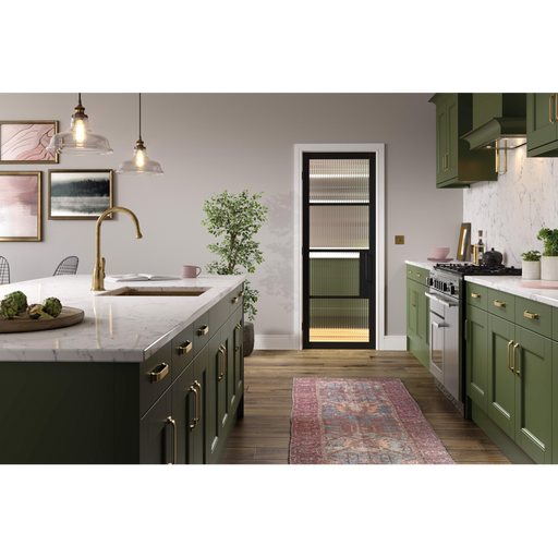 The Black Chelsea Glazed 4L Reeded internal door combines modern industrial aesthetics with a retro twist. Featuring four generous reeded glazed pa...