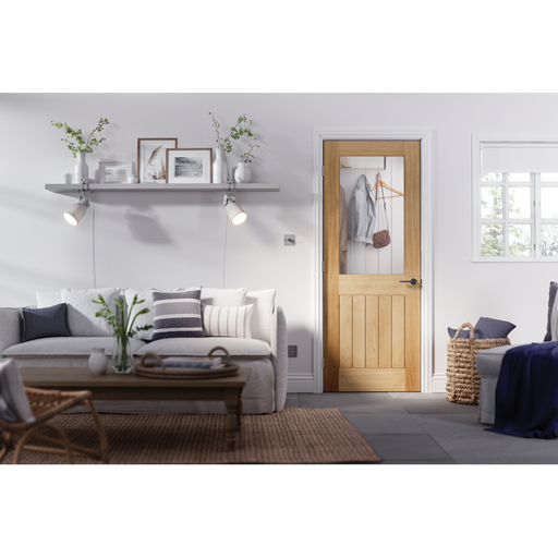 The Pre-Finished Oak Belize Glazed 1L door is the perfect choice for modern interiors, combining contemporary design with natural light enhancement...