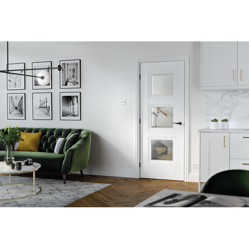 The WHITE AMSTERDAM GLAZED 3L internal door combines modern elegance with timeless charm. Featuring three clear glazed panels surrounded by decorat...