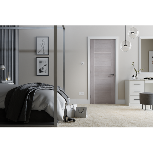 Enhance your modern interior with the Light Grey Vancouver 5P, a stylish and contemporary internal door featuring a sleek ladder-style panel design...