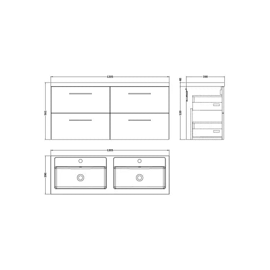 Arno Wall Hung 4 Drawer Vanity or Double Polymarble Basin, 1200mm