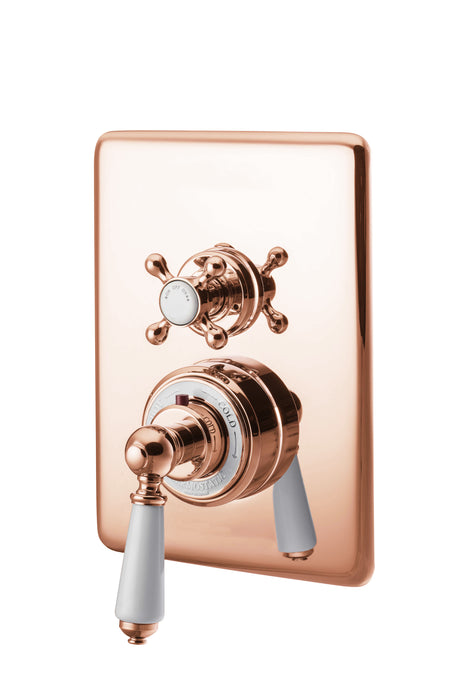 Upgrade your shower experience with The Thermostatic Concealed Shower Valve. Made from solid brass and available in three luxurious polished metal finishes, this shower valve features ceramic levers for a touch of elegance. Utilizing the latest thermostatic cartridge technology, it ensures optimal temperature control and safety. Dual controls allow for independent operation of water flow and temperature, providing a customized and comfortable shower experience.