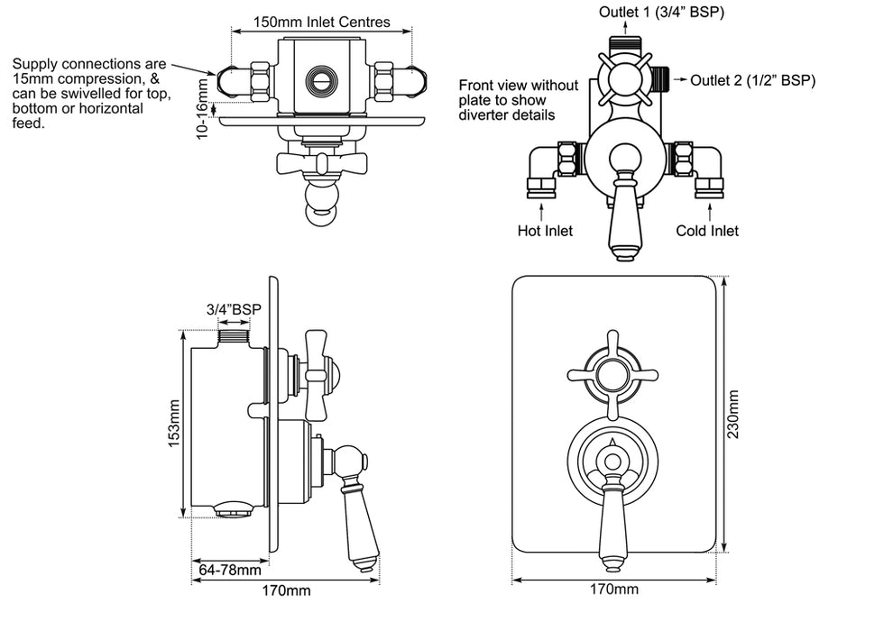 Hurlingham Dual Control Thermostatic Concealed Shower Valve, 2 Outlets