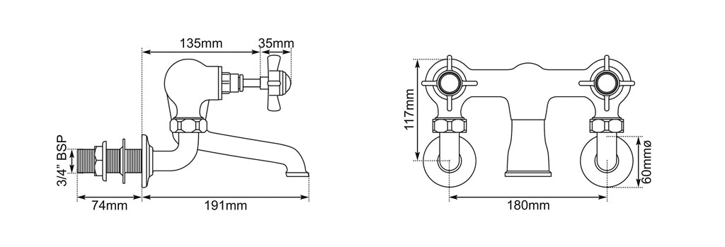Hurlingham Crosshead 2-Hole Wall-Mounted Bath Filler Taps 200 x 117mm