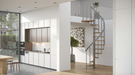 The CALGARY spiral staircase is the perfect space-saving solution for accessing raised floors, lofts, or mezzanine areas while adding a touch of modern elegance to your home. Its sleek design, combined with high-quality materials and customizable options, ensures a seamless fit for any space. Available in white, anthracite, or light grey finishes, the staircase features 11 durable treads and a substantial landing platform, both crafted from premium varnished beech multiplex wood for long-lasting durability.